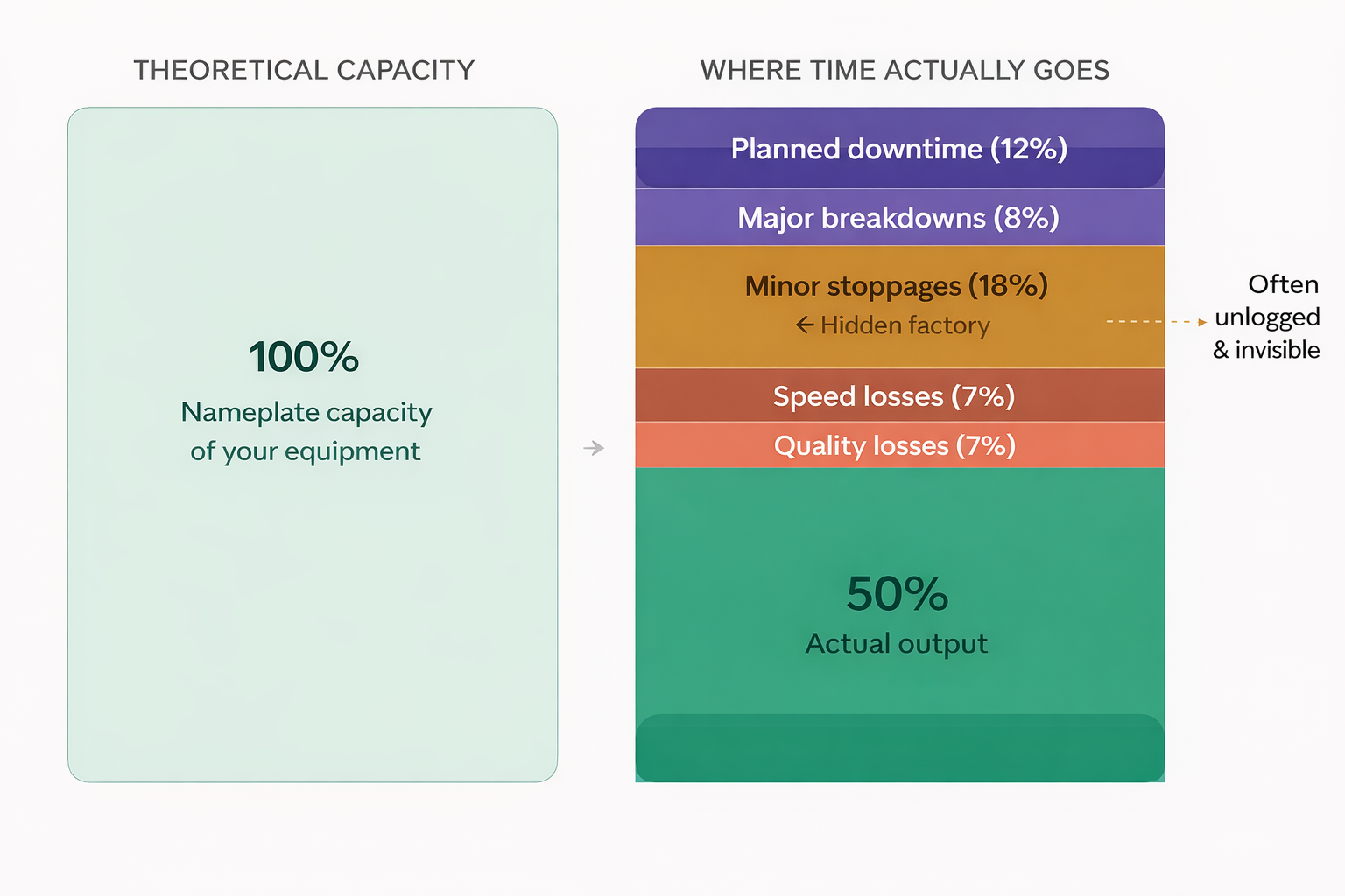 This is where most plants see the biggest opportunity for plant productivity improvement, by focusing on the losses that actually impact output and taking structured steps to reduce manufacturing losses.