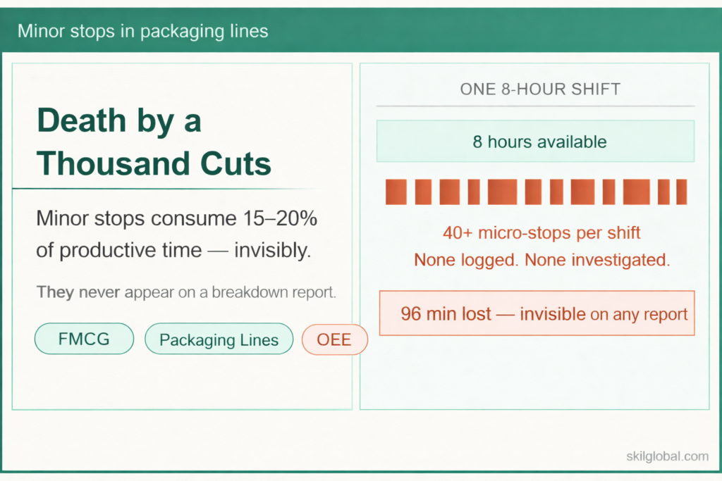 Minor stops don’t. They last 30 seconds. Maybe a minute. An operator clears a jam, the line starts again, and production continues. Individually, they seem insignificant. But across a three-shift operation, they are “Death by a Thousand Cuts.” They quietly consume 15–20% of your productive time without ever appearing on a breakdown report. The real problem isn’t that they exist—it’s that they don’t feel “broken” enough to fix.