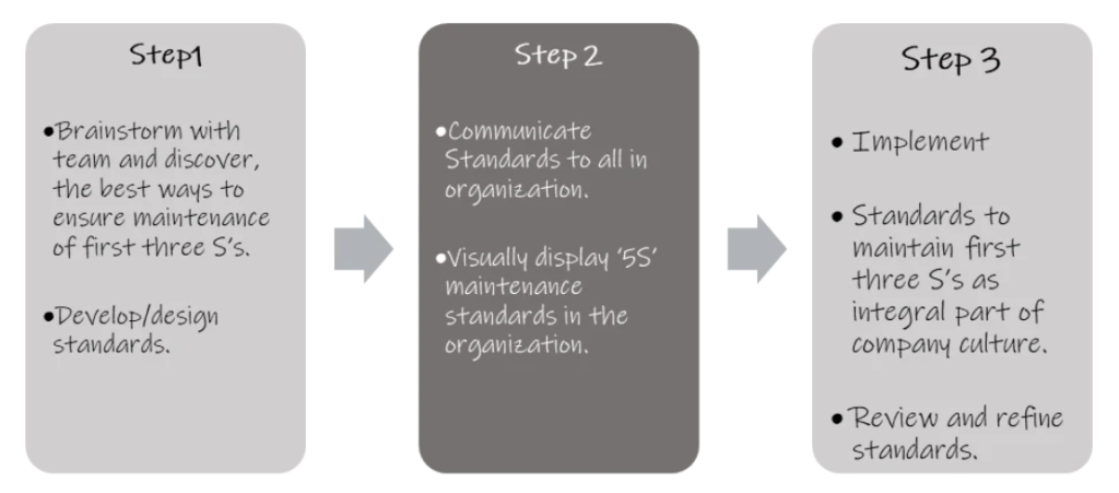 The ‘standardize’ step is extremely important. This is because it works toward ensuring that the first 3 Ss (‘sort’, ‘set in order’, and ‘shine’) become an integral part of a company’s culture! To universally apply good practice in every part of an organization is harder than putting just one in place. Therefore, standardization is crucial.